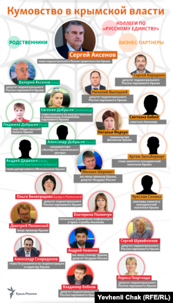 Подконтрольный России премьер Крыма Сергей Аксенов после аннексии трудоустроил во власти почти всю свою родню. Должности также достались его бывшим соратникам по партии «Русское единство» и партнерам по семейному бизнесу.