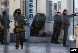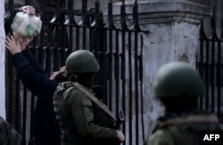 Российские солдаты задерживают украинских военных в Симферополе, 18 марта 2014 года