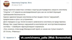 Прокуратура Ялты 27 апреля отрапортовала о закрытии трех объектов: кинотеатра «Спартак» и торговых центров «Конфетти» и «Дом торговли». В сообщении ведомства утверждается, что в этих учреждениях нарушаются правила пожарной безопасности.