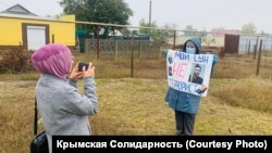 Во время одиночного пикета матери Рустема Эмирусеинова, Зуре, сотрудники полиции пытались забрать ее в отделение и составить протокол.