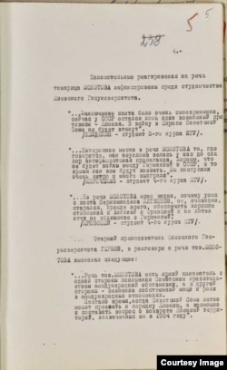 Во время разговора и обмена мнениями по поводу речи тов. Молотова в группе аспирантов КГУ, аспирант Жебокрицкий заметил: