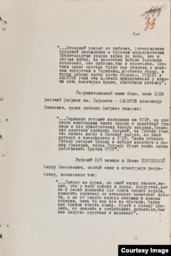 Разрабатываемый нами бывш. член ВКПб, рабочий фабрики им. Горького – Лазарев Александр Иванович среди рабочих фабрики говорил: