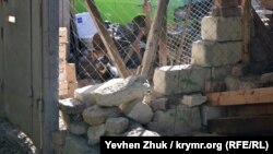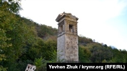 Продвигаюсь дальше по балке. Дачи заканчиваются, за ними высится водонапорная башня Микрюковского водовода, построенная в 1885 году, о чем вещает надпись на частично разрушенном портике. Памятник архитектуры. Ближе к выходу из балки располагался хутор Микрюковых, потомственных офицеров Черноморского флота, которые и построили водовод с башней. Под башней, использовавшейся для вентиляции, находятся резервуары для воды. И сейчас они пригодились для водоснабжения садового товарищества в балке.