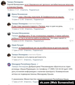 На странице Сергея Аксенова в соцсети «Вконтакте» жители Крыма тоже оставляют немало жалоб на отсутствие необходимых лекарств в аптеках. Из-за этого вынуждены заказывать их через родственников и знакомых в соседней России и ожидать заказа длительное время, пишут они.