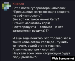 "Это вот как такое может быть? В таких масштабах горят нефтепродукты — топливо — и нет загрязнения воздуха? И еще ведь понятно, что топливо в таких количествах горящее — тушить нечем, водой это не тушится. А количество там — ого-го! Неужели всем этим сгорающим будут люди дышать?" — задался вопросом пользователь Кирилл.