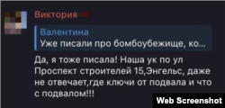 — Сейчас люди в чатах домов массово просят решить вопросы с подвалами, просят, чтобы им эти подвалы открыли или дали ключи, чтобы можно было спрятаться в случае чего, — констатировала жительница Энгельса.