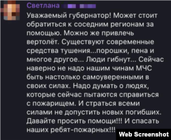 "Люди гибнут… <...> Надо думать о людях, которые сейчас пытаются справиться с пожарищем и стараться всеми силами не допустить новых погибших. Давайте просить о помощи".