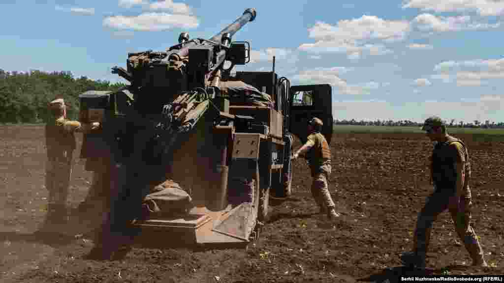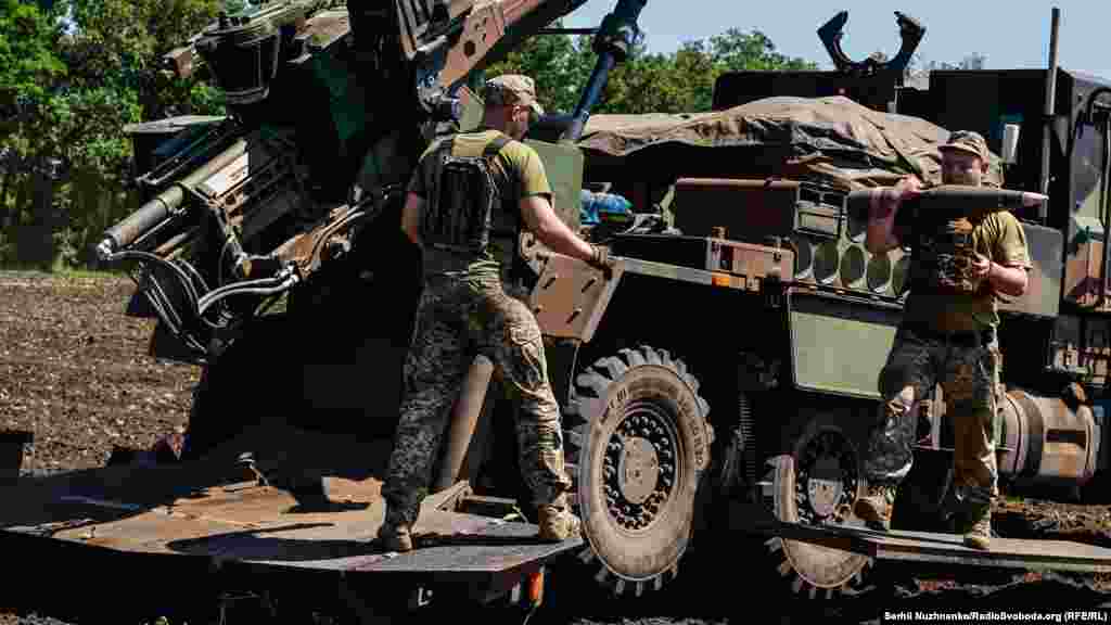 Украинские военные готовят снаряды для самоходной артиллерийской установки «Цезарь» (Caesar) вблизи линии фронта, Донецкая область
