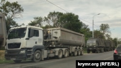 Сегодня в Крыму в селе Орехово под Саками стояла колонна из пяти грузовиков-зерновозов и четырех военных «КАМАЗов». Об этом сообщает корреспондент Крым.Реалии.