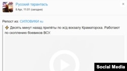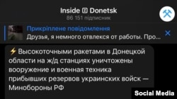 Почти сразу после удара по железнодорожному вокзалу Краматорска другой Telegram-канал – Inside Z Donetsk – также распространил сообщение, в котором со ссылкой на Минобороны РФ говорилось об уничтожении ракетами сил ВСУ.