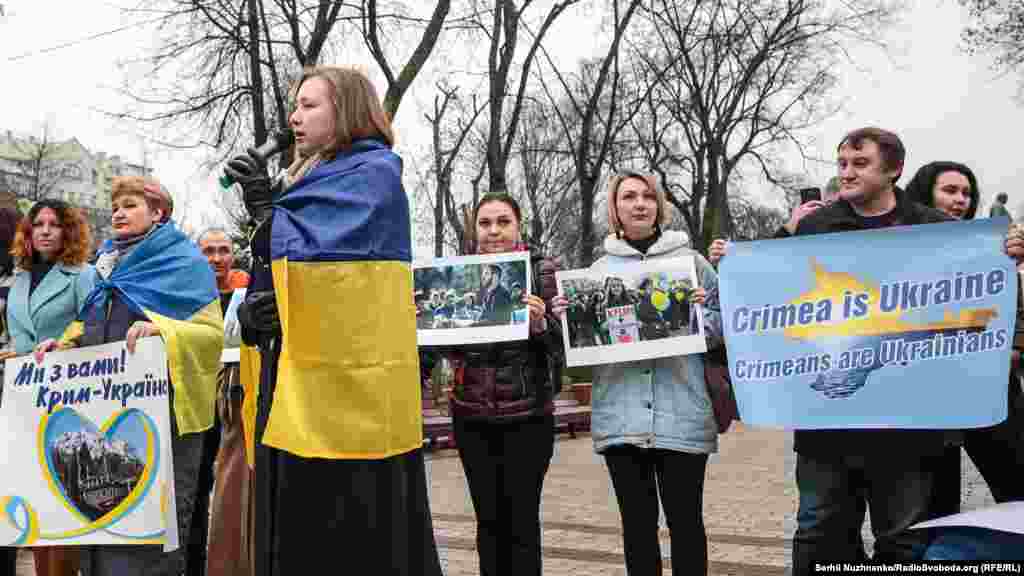 Собравшиеся пришли в парк имени Тараса Шевченко с украинскими и крымскотатарскими флагами, плакатами «Крым – это Украина» и фотографиями, на которых запечатлены кадры акций в поддержку территориальной целостности Украины в Крыму. Участники акции пели гимн Украины, а также обращались к жителям полуострова со словами поддержки.
