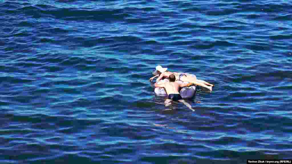 Купальщики отдыхают на надувном матрасе в водах бухты Ласпи, омывающей одноименный поселок Севастополя. Скалы, море, галечный пляж – живописный ландшафт урочища Ласпи превратили поселок в востребованный среди туристов и местных курорт.