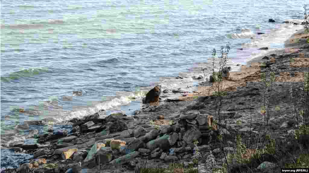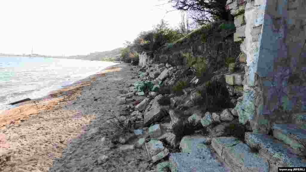 На пляже разрушена опорная стена из местного ракушечника, защищавшая береговую линию от оползней. Каменная кладка рухнула на пляж, на песке и в кромке прибоя лежат груды камней.
