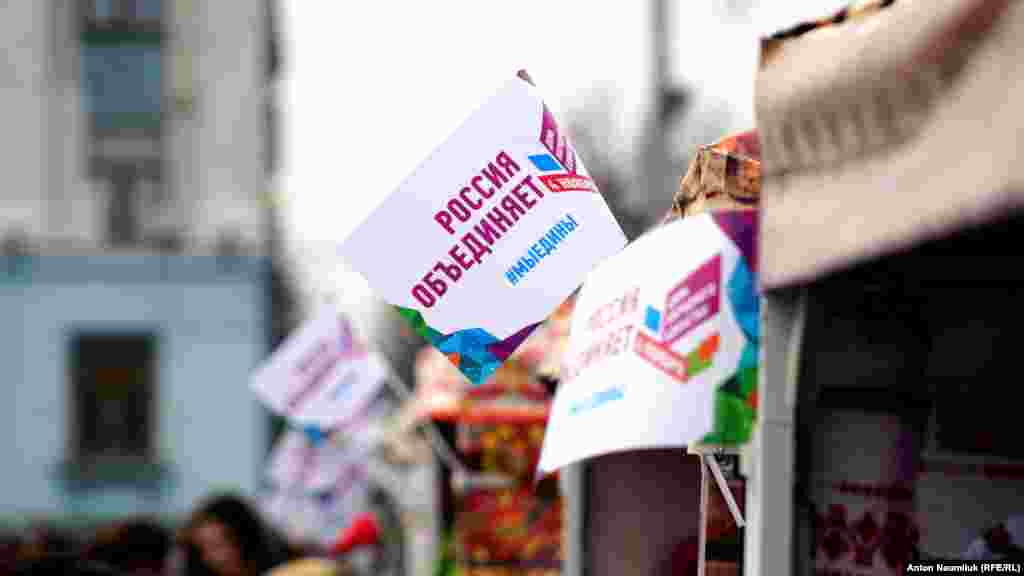 В Симферополе празднования начались на площади Ленина, где были организованы палатки с товарами ручной работы и блюдами национальной кухни. На площади флагов и символики партии «Единая Россия» было больше, чем российских флагов. На сцене выступали детские коллективы, милитаризованные организации «патриотического воспитания молодежи».